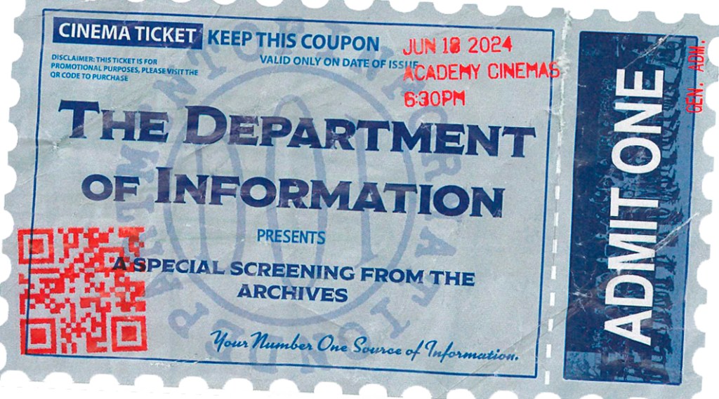 Promotional sticker and a screening flyer for The Department of Information